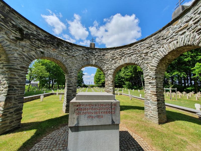 Belle promenade facile, émouvante à la découverte du cimetière Pierre Massé. Ce cimetière est la dernière demeure de 4 782 combattants morts en août 1914. Découvrez aussi l'histoire du calvaire breton. Les 3/4 de la promenades (3,5 km) sont sur petites routes asphaltée. La seule difficulté se situe au début de la promenade par une petite côte pour rejoindre le cimetière.