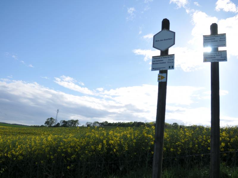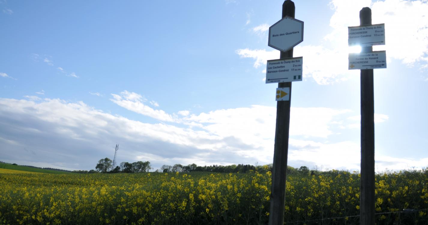 Balade de de 5.5 km à travers champs, prairies et bois au départ de la salle du village. Possibilité de prolonger la balade avec les 3 balades suivantes: promenade du fond d'Havinne (4 km), promenade du Bois de Porcheresse (7.2 km), promenade de Champ du Bois (14 km)