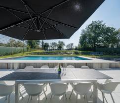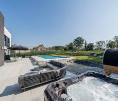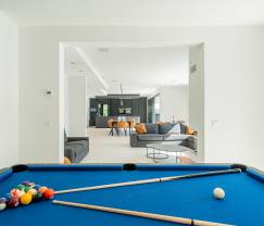 La villa dispose d'un vaste jardin privé et d'une impressionnante piscine extérieure chauffée de 12 m sur 7 m. Profitez du soleil sur la grande terrasse privée ou détendez-vous dans le jacuzzi et le sauna. Pour les sportifs, une table de ping-pong, un billard et un baby-foot sont disponibles. Les enfants peuvent s'amuser dans la salle de jeux et sur les installations de jeux extérieurs.