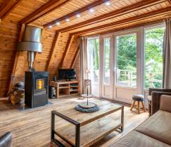 Un environnement boisé, une jolie vue sur la campagne depuis la terrasse, une ambiance chaleureuse dans un chalet confortable.