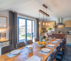 Ambiance maison de campagne pour cette superbe demeure aménagée de main de maître. Ses meubles en bois à l’aspect vieilli, sa décoration soignée et ses nuances sobres et chaleureuses offriront un lieu de loisirs et de repos haut de gamme pendant votre séjour. Vous aurez la chance de bénéficier à volonté d’un espace détente à l’atmosphère zen et harmonieuse, incluant une cabine infrarouge et un jacuzzi extérieur. Chacun disposera d’un coin plus intime dans l’une des 5 chambres joliment personnalisées. Sa pièce à vivre spacieuse est d’une grande clarté et fait la part belle aux matériaux nobles soulignés d’une touche contemporaine. Elle comprend un vaste séjour ouvert sur la partie salle à manger qui dispose d’une magnifique table en bois pour des retrouvailles conviviales autour d’un bon repas. Sa cuisine combine élégamment des équipements modernes à un esprit d’antan et offre une superficie particulièrement agréable et fonctionnelle. Vous profiterez d’un extérieur de 300 m² avec terrasse et jardin ainsi que des jeux pour enfants !