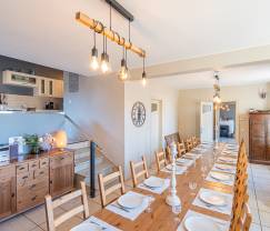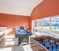 Cette belle maison de village centenaire dégage du caractère. Dedans, tout est joliment rénové et pratique pour votre séjour en groupe. Chaque chambre dispose de sa propre salle de bain/douche. Une salle de jeux permet aux petits et grands de s'amuser. Et un feu de bois crée une ambiance agréable dans le salon.
