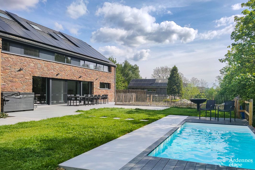 Située à Ferrières, cette villa de luxe pour 15 personnes offre un cadre exceptionnel pour des vacances inoubliables en Ardenne. Avec ses 7 chambres spacieuses et ses 6 salles de bain modernes, cette maison de vacances allie confort et élégance pour accueillir familles et groupes d'amis dans un environnement chaleureux et raffiné.