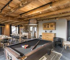 Dans la partie "Espace de vie", chacun trouvera son bonheur grâce aux différents espaces créés : le salon principal avec feu ouvert et coin bar vous offrira d'inoubliables moments de convivialité tandis qu'un niveau plus haut, vous passerez aussi du bon temps autour du billard ou en concoctant de délicieux mets dans la cuisine hyper équipée.