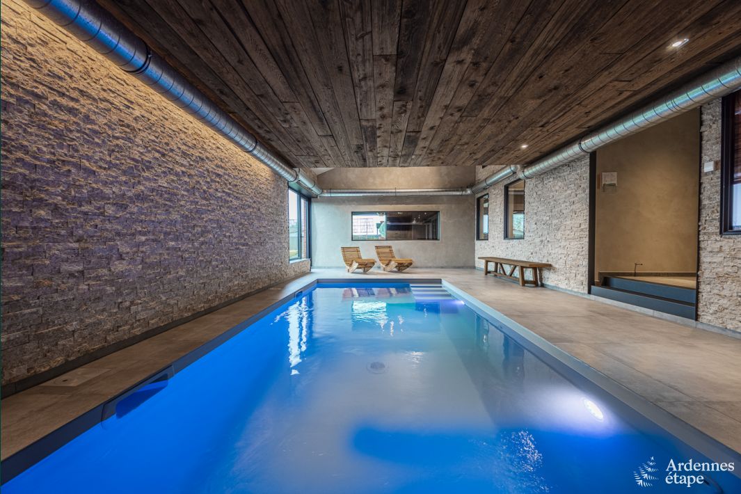 Cosy, chaleureuse et authentique sont les adjectifs parfaits pour décrire cette belle villa aux allures d’hôtel boutique. Les éléments de décoration soigneusement choisis (le bel arbre de la salle à manger est notre coup de cœur !), la profusion de bois et la palette de couleurs naturelles créent un ensemble harmonieux rendant hommage à l’environnement ardennais. De quoi vous mettre en mode vacances en un rien de temps ! Octroyez-vous une délicieuse grasse matinée dans l’une des 7 superbes chambres avec salle de bains, bien loin de l’agitation. Installez-vous confortablement près du foyer encastrable, réchauffez-vous dans le sauna ou profitez de la piscine intérieure chauffée. L’extérieur est également des plus agréables : envie d’un petit barbecue (d’hiver) ou d’une partie de pétanque ? Et pourquoi ne pas faire les deux ? Vous avez tout votre temps ! Vous pouvez même en profiter jusqu’au bout de la nuit, grâce au superbe éclairage extérieur.