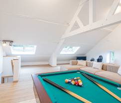 La maison dispose de 5 chambres et de 5 salles de bains, offrant ainsi suffisamment d'espace pour tout le monde. Pour les tout-petits, il y a un lit bébé et une chaise haute. Les deux salons au rez-de-chaussée offrent un endroit convivial pour se détendre près de la cheminée à cassette ou pour une partie de baby-foot. À l'étage supérieur, vous trouverez à la fois une salle de jeux avec playstation, home cinéma et billard ainsi qu'un espace détente avec une cabine infrarouge.