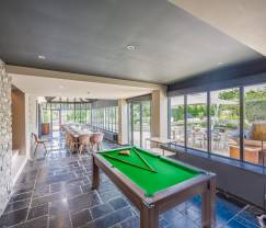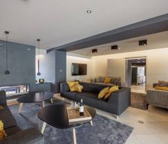 Quand vous entrez dans cette immense villa de luxe avec son aménagement contemporain, vous ne savez pas où regarder en premier. En plus des 13 chambres joliment décorées et 12 salles de bains, vous disposez d'un grand nombre de salons, dont un grand salon avec télévision et poêle à bois. Vous voulez vous détendre après une journée dans la nature? C'est possible dans la salle de billard ou la salle de jeux avec baby-foot, fléchettes, jeux pour enfants et jeux de société. Vous êtes là pour travailler? Pour cela, vous disposez d'une grande salle de réunion avec projecteur, écran et paperboard. Est-il temps de passer à table? Alors direction la magnifique cuisine professionnelle avant de vous installer dans la grande salle à manger lumineuse avec une vue panoramique sur les environs. Ou peut-être préférez-vous faire un barbecue sur la grande terrasse après avoir profité du magnifique jardin et d'une baignade dans la piscine extérieure chauffée.