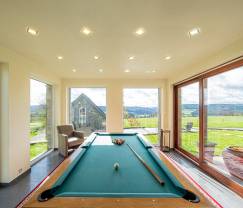 Cette maison de vacances située dans un hameau se distingue tout d'abord par ses vastes espaces, la qualité des matériaux utilisés et ses chambres toutes aménagées avec finesse et goût. Située à Stoumont, offrant un magnifique panorama sur la campagne, cette villa de vacances compte 8 chambres réparties sur deux niveaux et pouvant accueillir jusqu'à 18 personnes. Pour vos vacances dans les Ardennes belges, vous pourrez profiter de l'espace de détente aménagée au niveau 2 de la villa et comprenant un sauna et un banc solaire. Si un couple souhaite être un peu à l'écart, tout en vivant à souhait les joies du séjour de groupe, un studio avec salon, salle de bain et télévision, face au gîte principal, offre toute l'intimité voulue. Le barbecue, la piscine extérieure et le jardin ouvert de 8 000 m² vous attendent pour les beaux jours, tout comme la balançoire et la table de ping-pong.
