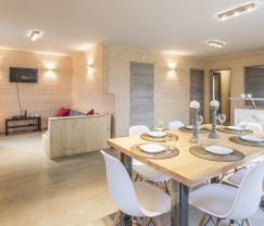 Poussez la porte d'entrée et laissez-vous charmer par la lumière qui baigne la grande pièce de séjour. Salon, salle à manger et cuisine ne forment qu'un ce qui renforce la convivialité des lieux. La cuisine toute équipée vous permettra de concocter de délicieux mets et pourquoi ne pas en profiter pour découvrir quelques spécialités régionales. Le salon et la salle à manger vous séduiront par leur ambiance agréablement réchauffée par le poêle à pellets.